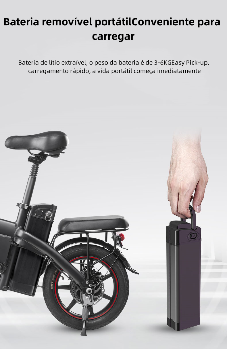 A bateria de iões de lítio de 48V com uma capacidade de 7,5Ah pode ser carregada diretamente na bicicleta ou removendo-a.