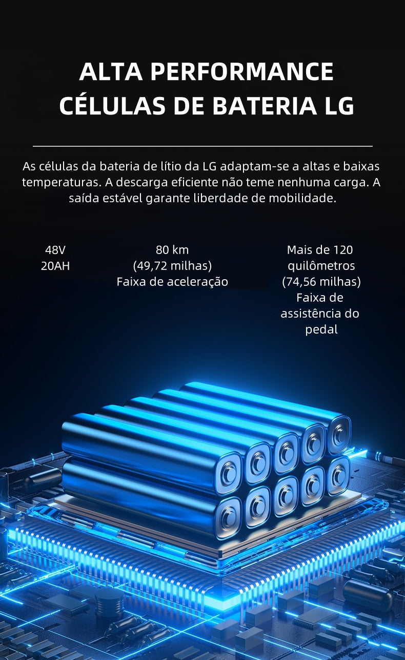 King750 使用 48V 20AH 的 LG 电池,提供出色的续航能力! 5000mah 锂电池,配备电池管理系统 (BMS),有助于提高电池的自主性和耐用性。