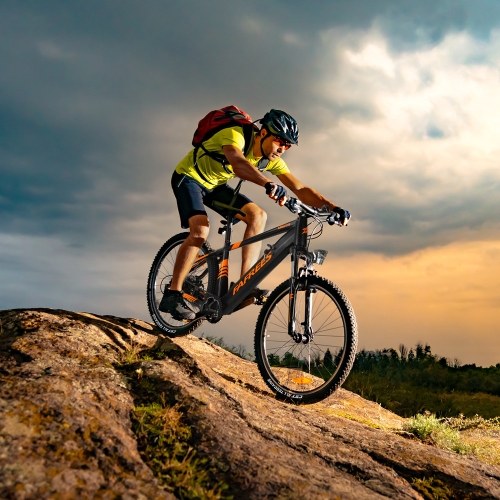 Adaptabilidade todo-o-terreno: pneus antiderrapantes de 27,5 polegadas, resistentes ao desgaste são adequados para diferentes terrenos. Um garfo de suspensão dianteiro bloqueável ajuda a absorver os choques em terrenos acidentados para oferecer uma condução confortável.